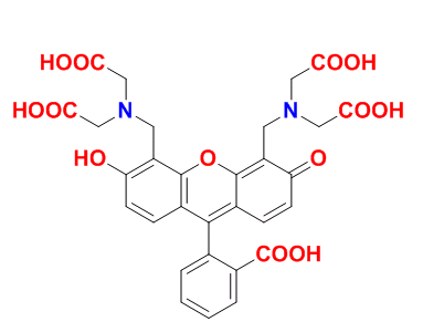 鈣黃綠素,也稱為熒光素,熒光素復(fù)合物,是一種熒光鈣指示劑,其激發(fā)和發(fā)射波長分別為495和515nm。鈣黃綠素在100 mM以上的濃度下會自動猝滅。它用作EDTA滴定鈣離子和熒光測定鈣的絡(luò)合指示劑,微溶于水。質(zhì)子解離常數(shù)為pKa1的= 2.1,pKa2 = 2.9,pKa3 = 4.2,pKa4 = 5.5,pKa5 = 10.8和pKa6 = 11.7。鈣黃綠素溶液在酸性條件下發(fā)出黃綠色熒光,而在堿性條件下不發(fā)出熒光。但是,鈣黃綠素在堿性條件下在金屬離子(例如Al,Ba,Cu,Mg和Zn)存在下發(fā)出熒光。因此,鈣黃綠素還可以用于除Ca之外的這些重金屬離子的直接熒光滴定。